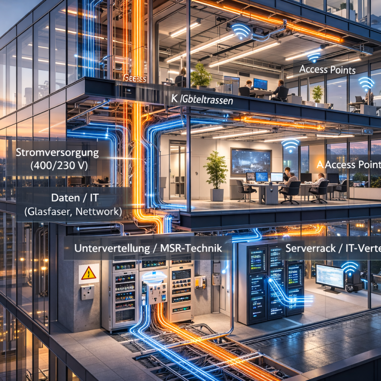 - IT- und Kommunikationsinfrastruktur Strukturierte Verkabelung (Kupfer/Glasfaser), WLAN, Server- und Netzwerktechnik für digitale Arbeitsplätze.